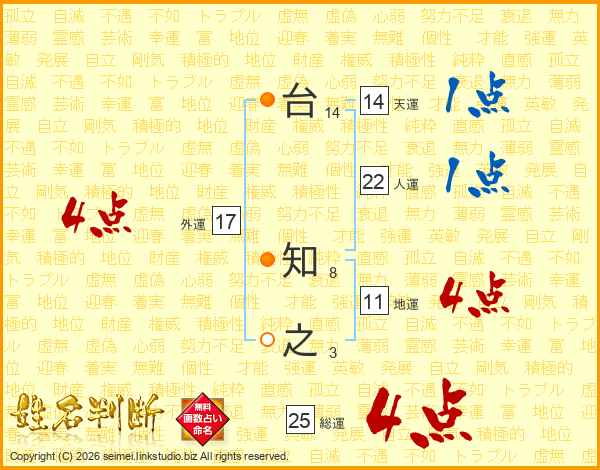 生活面を象徴する運勢です。外部から受ける影響力を表し、結婚運、家庭運や職場、環境への順応性を表します。総運から人運を引いた画数。姓や名が1文字の場合を除く。