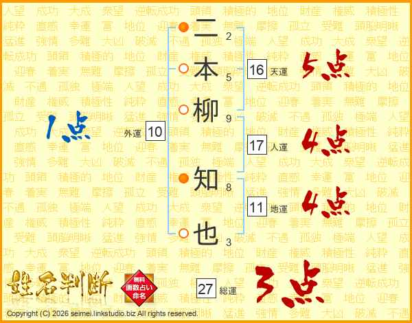 二(2画)本(5画)柳(9画) 知(8画)也(3画)