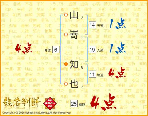 山嵜知也さんの総運は25画の4点!