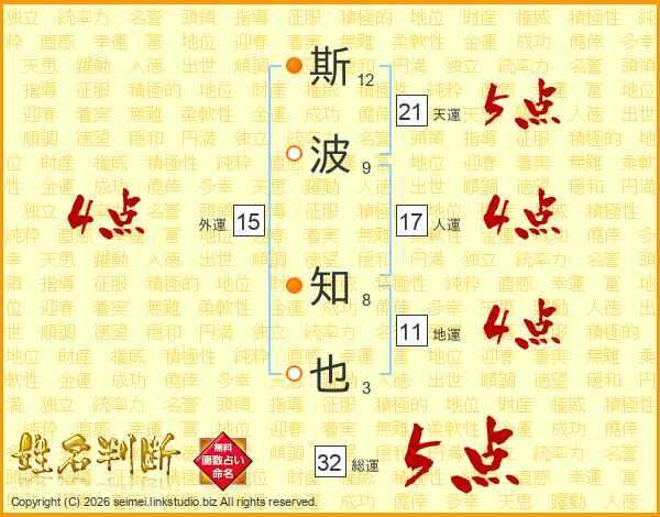あなたの人生を表す1番重要な運勢です。生涯を通じて影響する総合運となり、主に50歳以降の晩年期に影響を及ぼします。苗字と名前の合計画数。