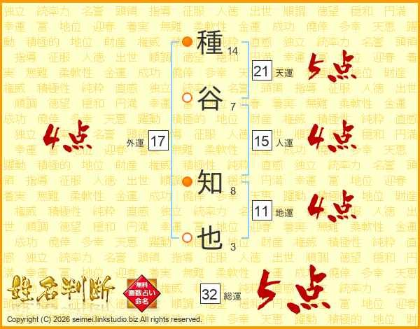 種谷知也さんの総運は32画の5点!