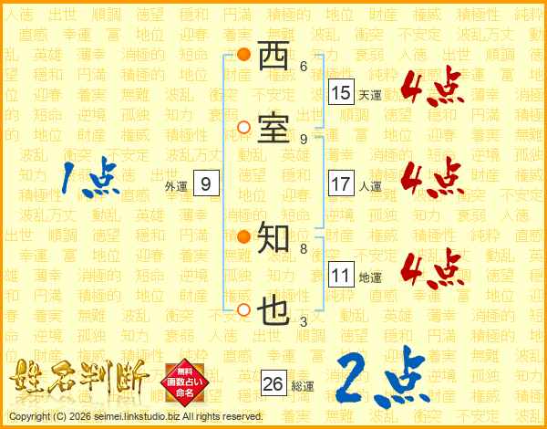西室知也さんの総運は26画の2点!