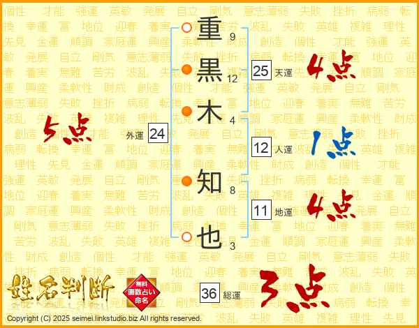 重(9画)黒(12画)木(4画) 知(8画)也(3画)