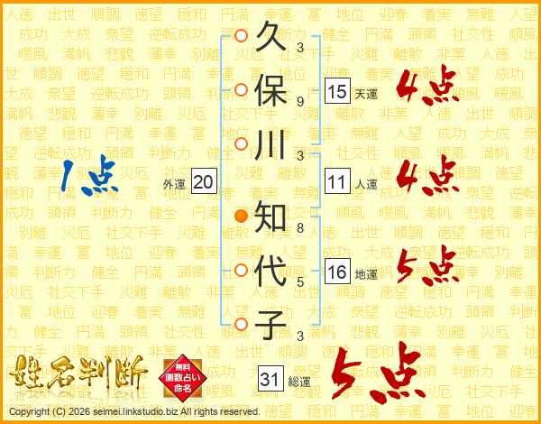 久(3画)保(9画)川(3画) 知(8画)代(5画)子(3画)