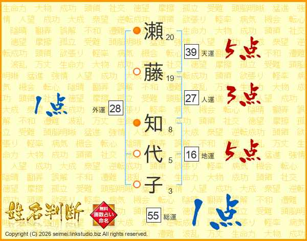 瀬(20画)藤(19画) 知(8画)代(5画)子(3画)