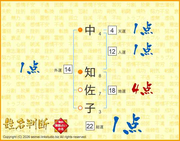 生活面を象徴する運勢です。外部から受ける影響力を表し、結婚運、家庭運や職場、環境への順応性を表します。総運から人運を引いた画数。姓や名が1文字の場合を除く。