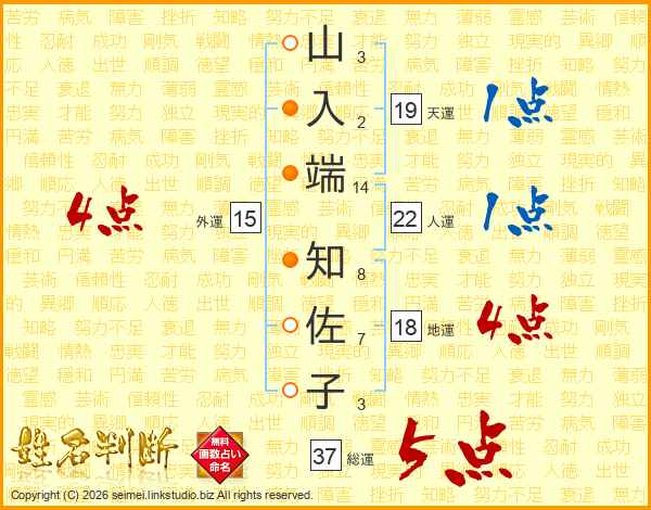 山(3画)入(2画)端(14画) 知(8画)佐(7画)子(3画)