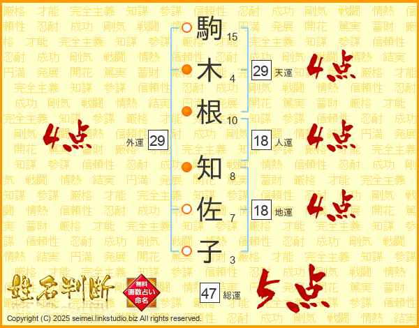 駒(15画)木(4画)根(10画) 知(8画)佐(7画)子(3画)