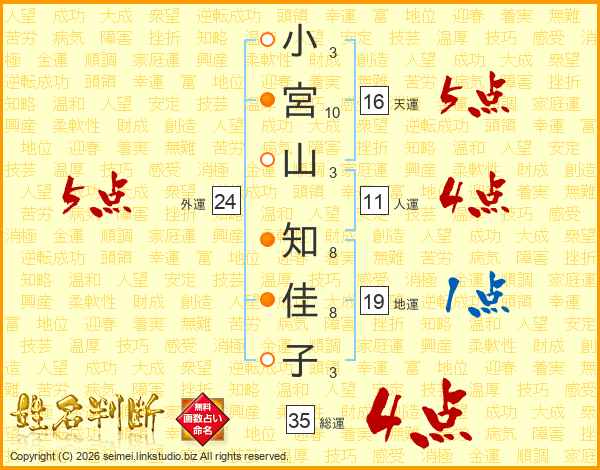 小(3画)宮(10画)山(3画) 知(8画)佳(8画)子(3画)