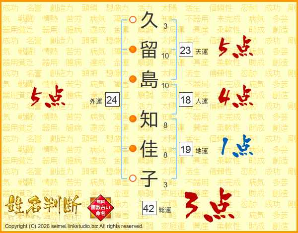 久(3画)留(10画)島(10画) 知(8画)佳(8画)子(3画)