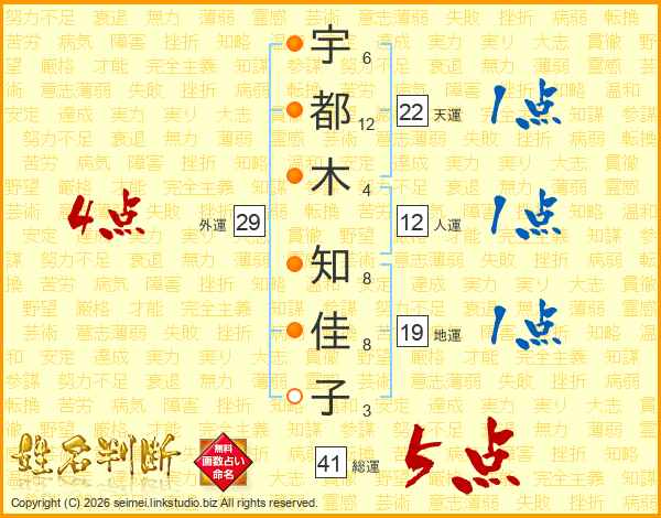 宇(6画)都(12画)木(4画) 知(8画)佳(8画)子(3画)