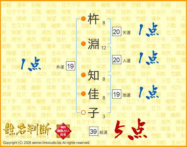 杵(8画)淵(12画) 知(8画)佳(8画)子(3画)