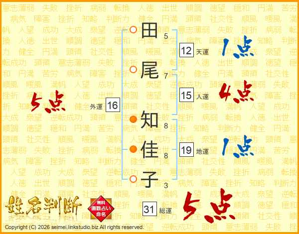 田(5画)尾(7画) 知(8画)佳(8画)子(3画)