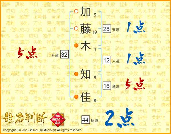 加(5画)藤(19画)木(4画) 知(8画)佳(8画)