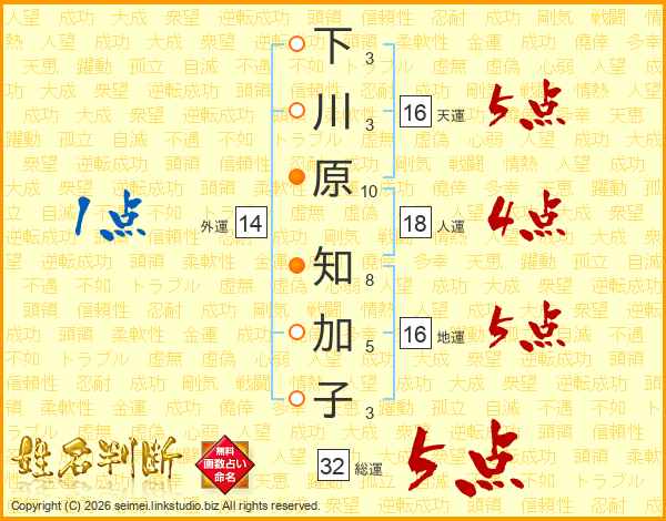 生活面を象徴する運勢です。外部から受ける影響力を表し、結婚運、家庭運や職場、環境への順応性を表します。総運から人運を引いた画数。姓や名が1文字の場合を除く。