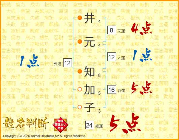 井(4画)元(4画) 知(8画)加(5画)子(3画)