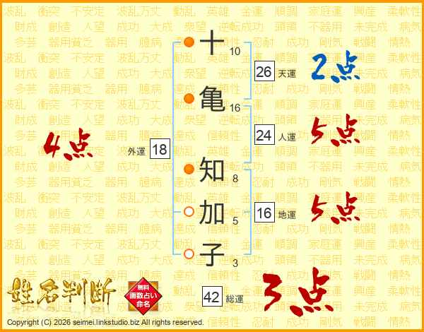 十(10画)亀(16画) 知(8画)加(5画)子(3画)