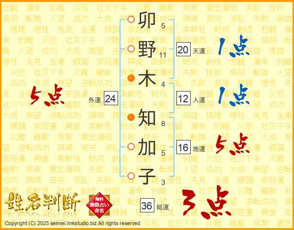 卯(5画)野(11画)木(4画) 知(8画)加(5画)子(3画)