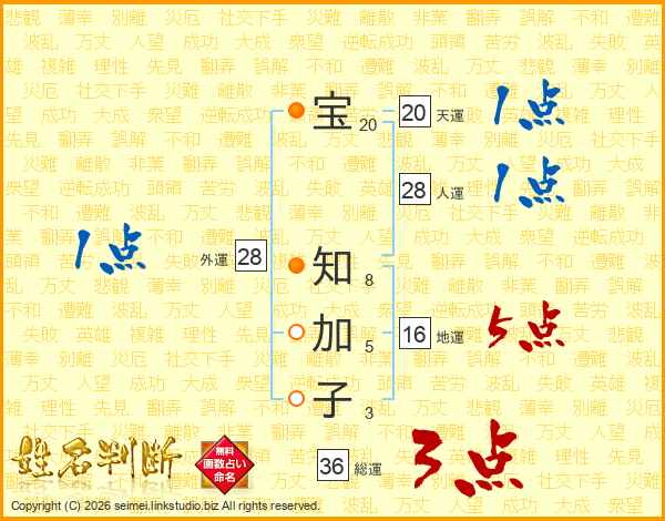 生活面を象徴する運勢です。外部から受ける影響力を表し、結婚運、家庭運や職場、環境への順応性を表します。総運から人運を引いた画数。姓や名が1文字の場合を除く。