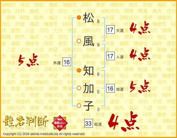 松(8画)風(9画) 知(8画)加(5画)子(3画)