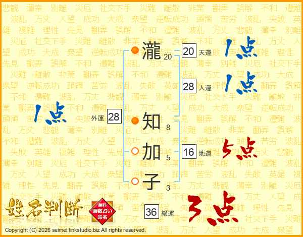 生活面を象徴する運勢です。外部から受ける影響力を表し、結婚運、家庭運や職場、環境への順応性を表します。総運から人運を引いた画数。姓や名が1文字の場合を除く。