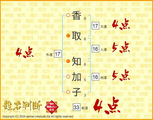 香取知加子さんの総運は33画の4点!