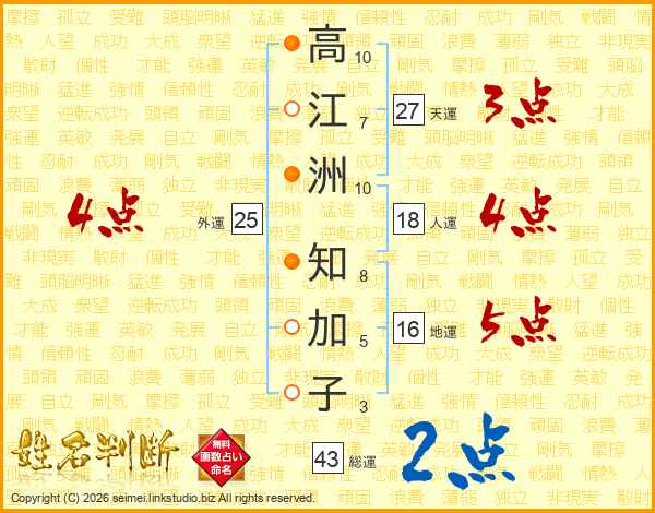 高(10画)江(7画)洲(10画) 知(8画)加(5画)子(3画)