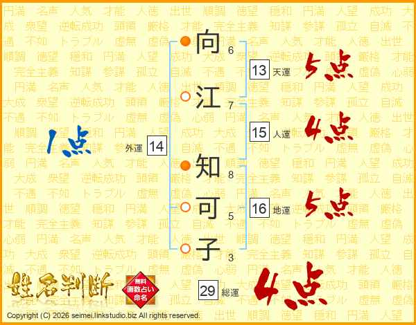 生活面を象徴する運勢です。外部から受ける影響力を表し、結婚運、家庭運や職場、環境への順応性を表します。総運から人運を引いた画数。姓や名が1文字の場合を除く。