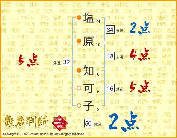 塩(24画)原(10画) 知(8画)可(5画)子(3画)