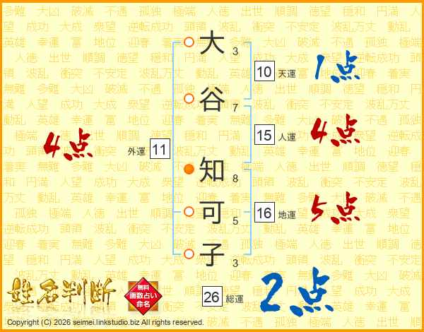 あなたの人生を表す1番重要な運勢です。生涯を通じて影響する総合運となり、主に50歳以降の晩年期に影響を及ぼします。苗字と名前の合計画数。