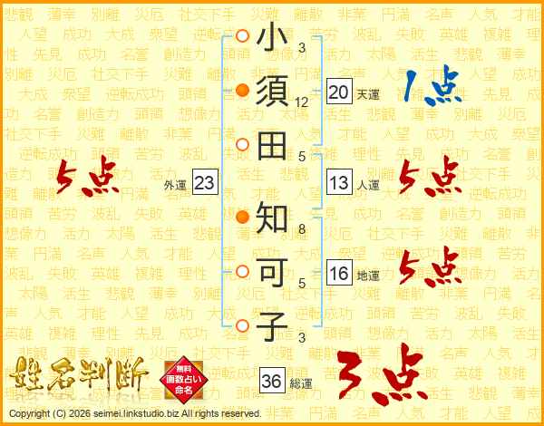 小(3画)須(12画)田(5画) 知(8画)可(5画)子(3画)