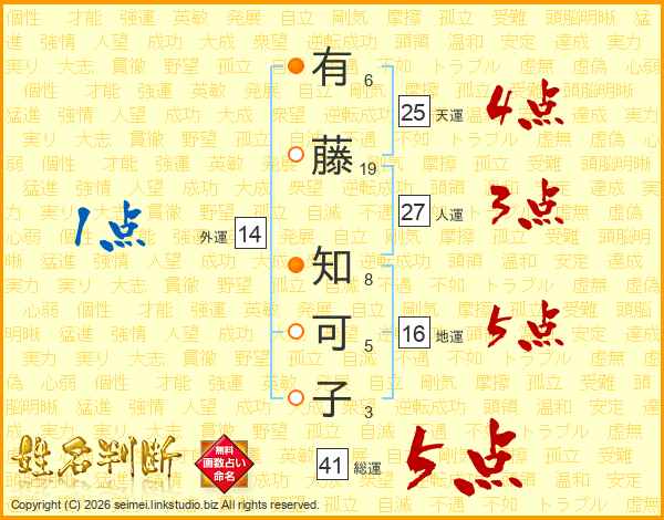 有藤知可子さんの総運は41画の5点!