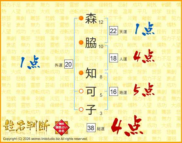 森(12画)脇(10画) 知(8画)可(5画)子(3画)