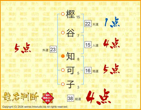 樫(15画)谷(7画) 知(8画)可(5画)子(3画)