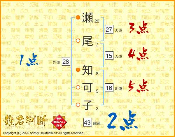 瀬(20画)尾(7画) 知(8画)可(5画)子(3画)