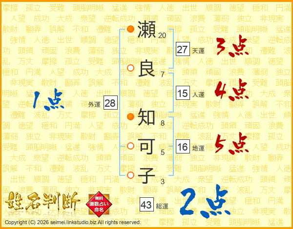 瀬(20画)良(7画) 知(8画)可(5画)子(3画)