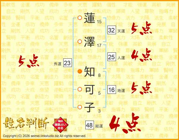 蓮(15画)澤(17画) 知(8画)可(5画)子(3画)