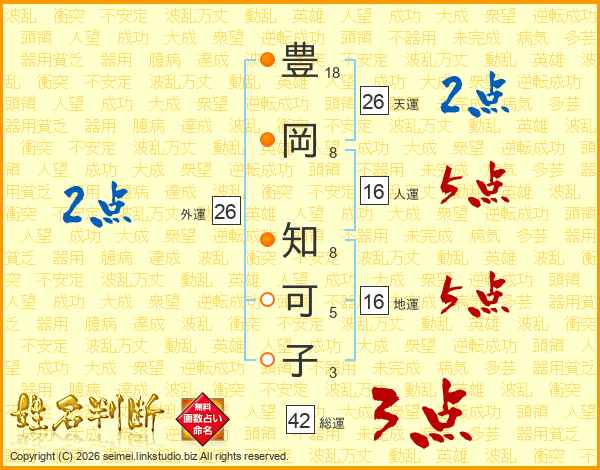 豊(18画)岡(8画) 知(8画)可(5画)子(3画)