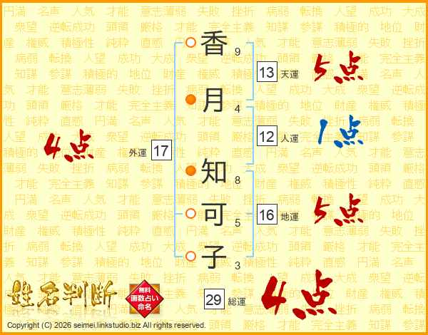 香(9画)月(4画) 知(8画)可(5画)子(3画)