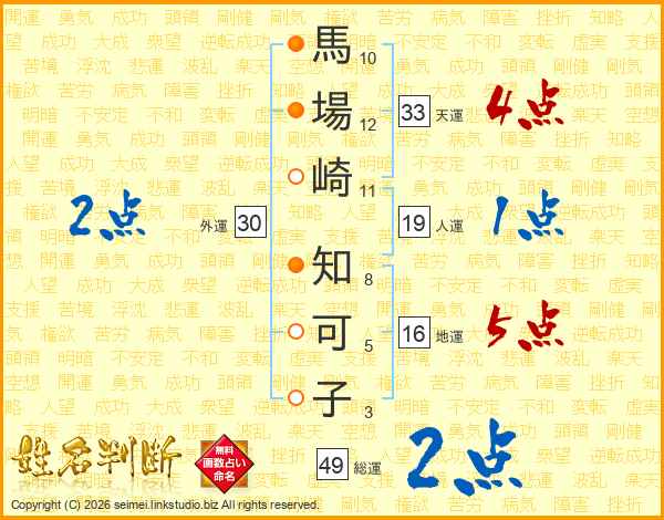 馬(10画)場(12画)崎(11画) 知(8画)可(5画)子(3画)