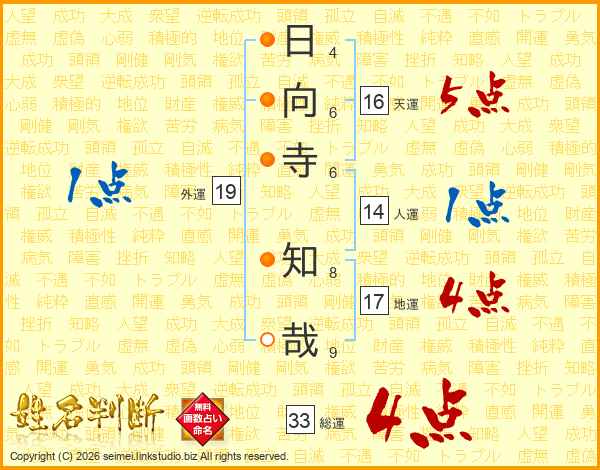 日(4画)向(6画)寺(6画) 知(8画)哉(9画)