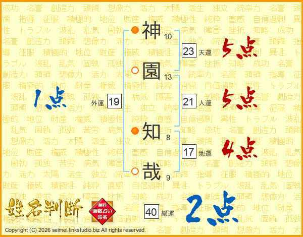 生活面を象徴する運勢です。外部から受ける影響力を表し、結婚運、家庭運や職場、環境への順応性を表します。総運から人運を引いた画数。姓や名が1文字の場合を除く。