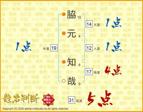 脇元知哉さんの総運は31画の5点!