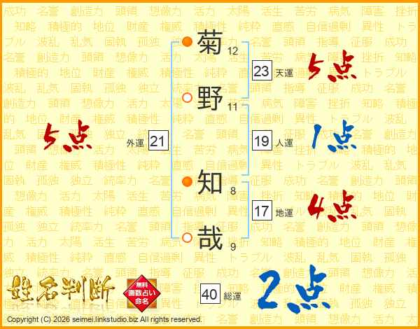 あなたの人生を表す1番重要な運勢です。生涯を通じて影響する総合運となり、主に50歳以降の晩年期に影響を及ぼします。苗字と名前の合計画数。