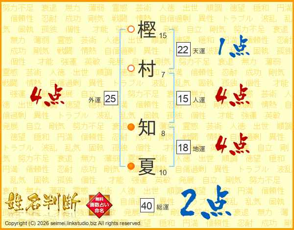 樫(15画)村(7画) 知(8画)夏(10画)