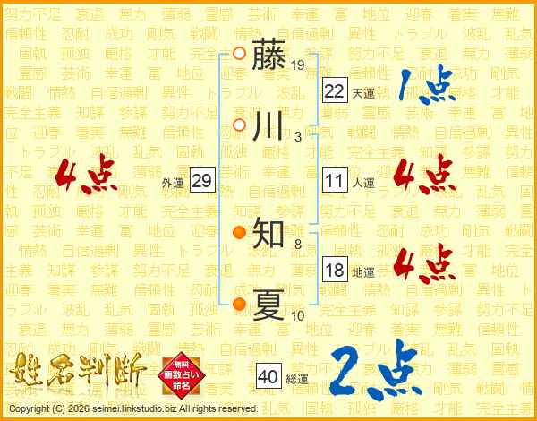 藤(19画)川(3画) 知(8画)夏(10画)