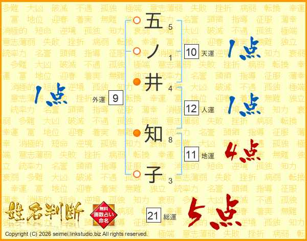 五ノ井知子さんの総運は21画の5点!