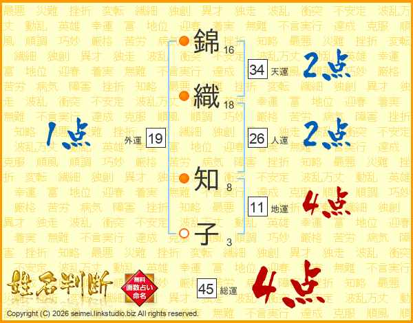 錦(16画)織(18画) 知(8画)子(3画)