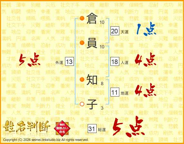 倉員知子さんの総運は31画の5点!