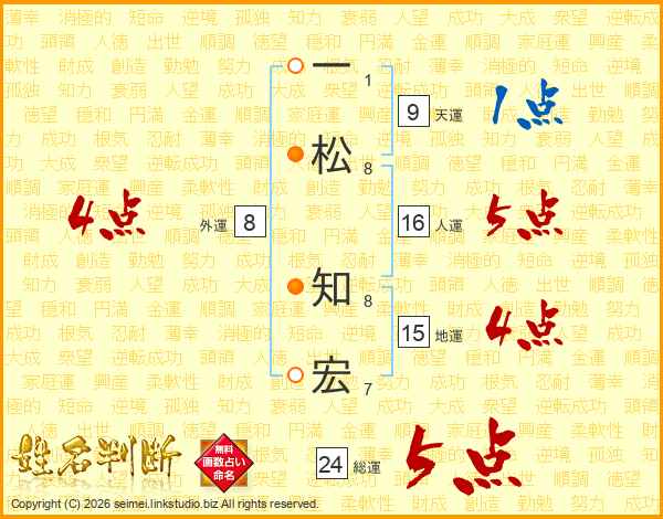 あなたの人生を表す1番重要な運勢です。生涯を通じて影響する総合運となり、主に50歳以降の晩年期に影響を及ぼします。苗字と名前の合計画数。